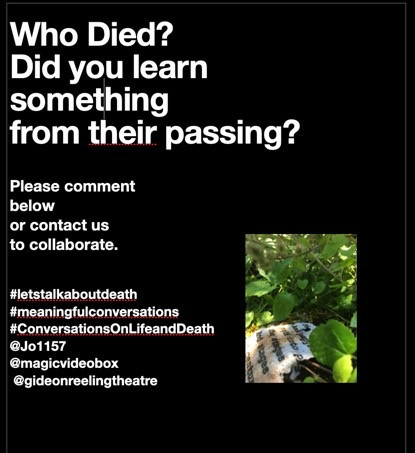 Jo's work has inspired Gideon Reeling's and contributed to our work for many years, in her words, its a project she's "been trying to get together for years in different shapes and forms... an ongoing, global, open conversation and creative collaboration based on the issues around death and dying that we all face.